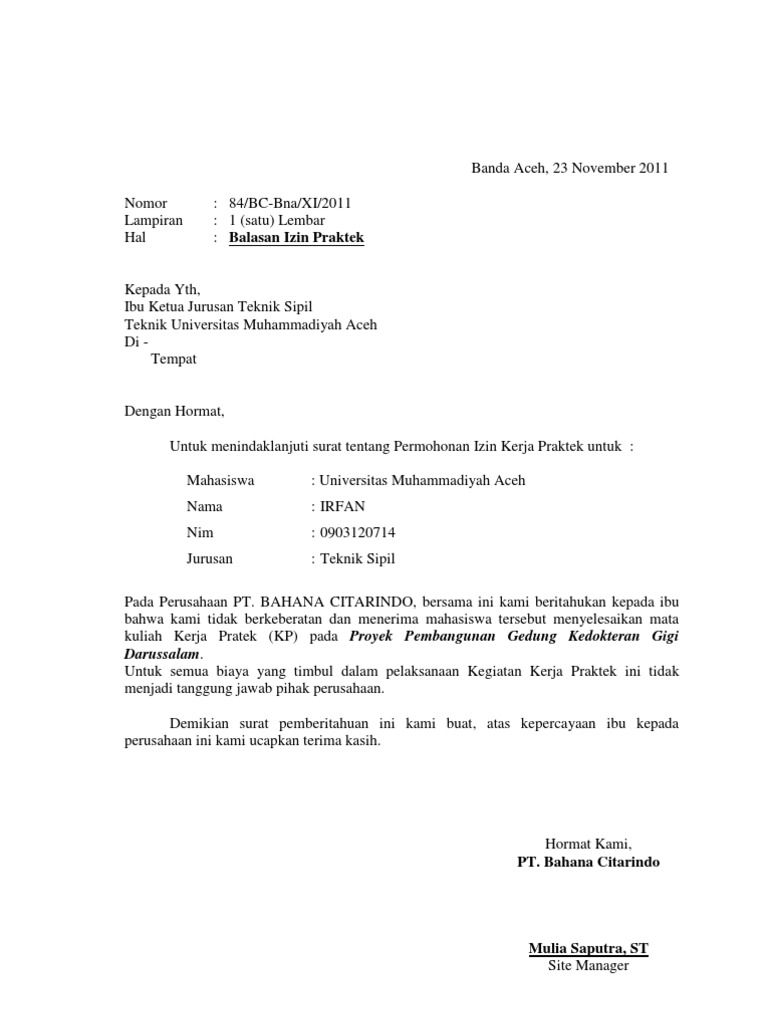 Berikut ini adalah contoh surat balasan penerimaan praktik kerja lapangan untuk berbagai jurusan yang bisa dijadikan contoh bagi perusahaan. Doc surat balasan izin penelitian fe novita juni 201666666 docx. 2how to write a resume cover. Created for just one purpose: Contoh surat permohonan magang kerja yang baik dan benar. Doc contoh surat pengantar magang eka soesilawati ningrum. Download as doc, pdf, txt or read online from scribd. Contoh surat balasan pkl dari perusahaan contoh surat. Contoh surat balasan pkl dari perusahaan contoh surat surat balasan kerja praktek doc contoh surat balasan permohonan kerja praktek docx size 13 balasan 3 contoh surat penawaran jasa perusahaan tahu surat kebidanan. Diisi dengan email yang masih aktif, karena balasan dari pertanyaan anda akan dikirimkan via email ini. Contoh surat keterangan usaha dari kepala desa / kelurahan. Contoh surat balasan pkl ini kami buat untuk anda semua supaya anda bisa langsung. Pastinya setiap individu bahkan instansi tidak akan lepas dari berkomunikasi baik itu sesama individu maupun instansi.